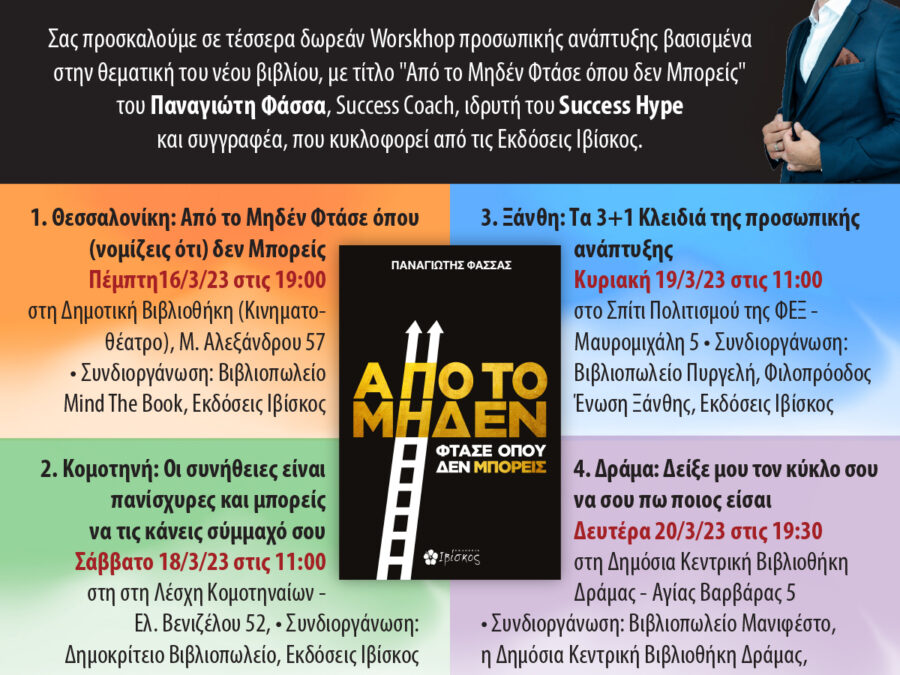 Ο Παναγιώτης Φάσσας, ιδρυτής του SuccessHype και συγγραφέας του βιβλίου «Από το Μηδέν Φτάσε όπου δεν μπορείς» έρχεται σε τέσσερις πόλεις της Βόρειας Ελλάδας για να πραγματοποιήσει 4 ΔΙΑΦΟΡΕΤΙΚΑ workshops προσωπικής ανάπτυξης, βασισμένα στη θεματική του νέου του βιβλίου!!